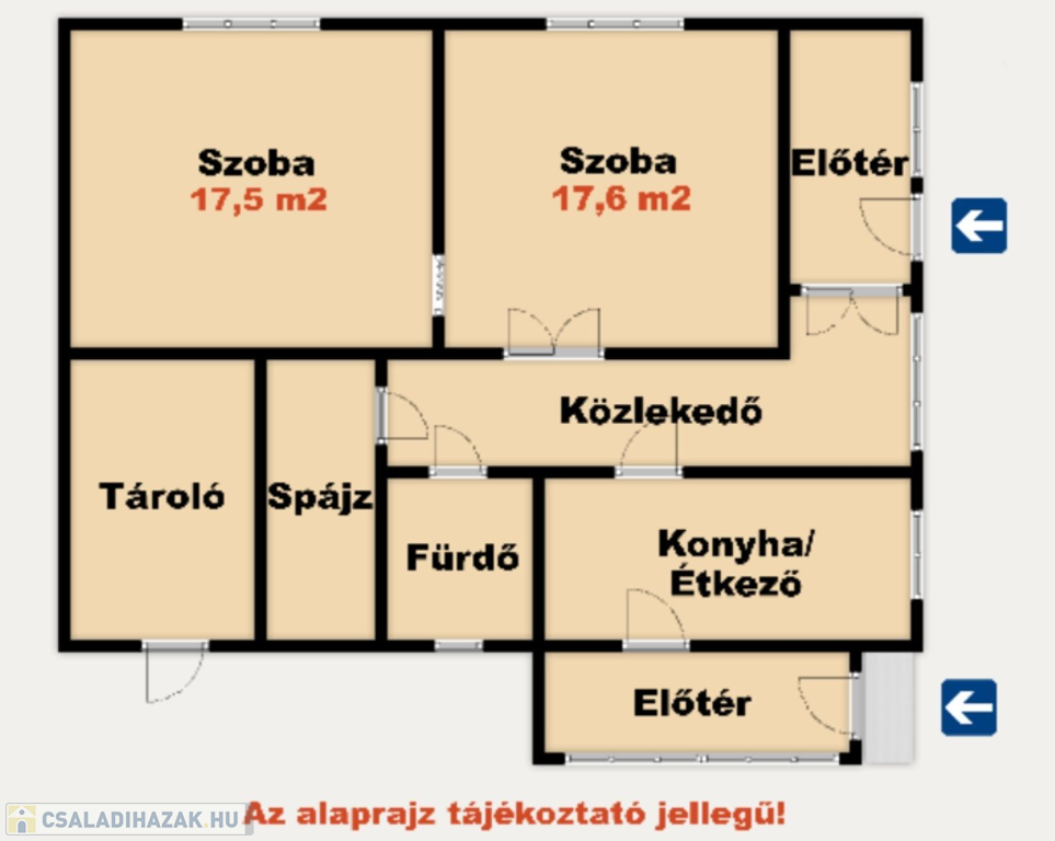 A ház fűtéséről gázkonvektorok és kandalló gondoskodnak, a meleg vizet gázbojler biztosítja. A praktikus elrendezésű lakótérben két szoba, két előtér, fürdőszoba, konyha-étkező, közlekedő, spájz és egy tároló található. Az ingatlanhoz tartozik egy 16 m2-es garázs is.