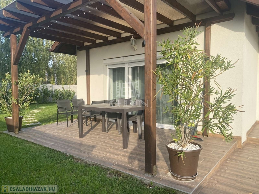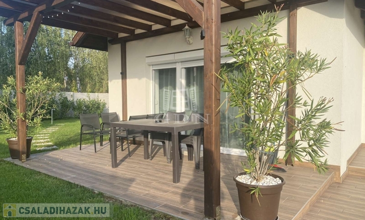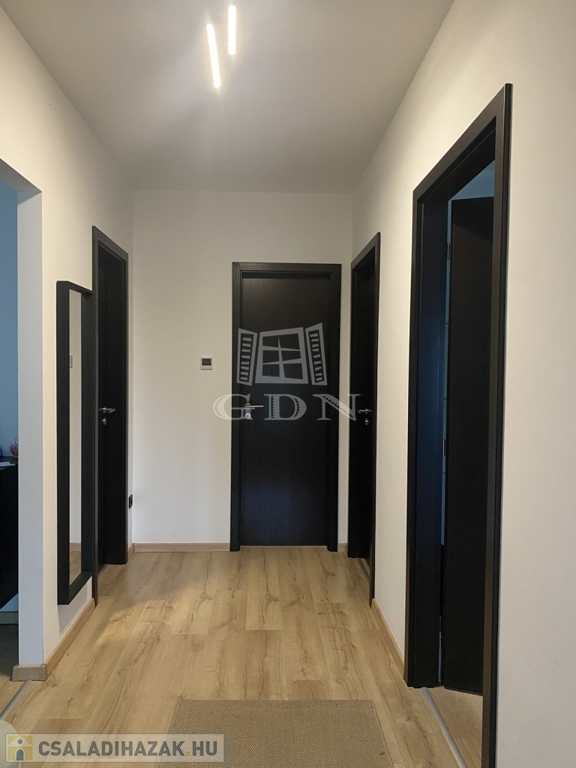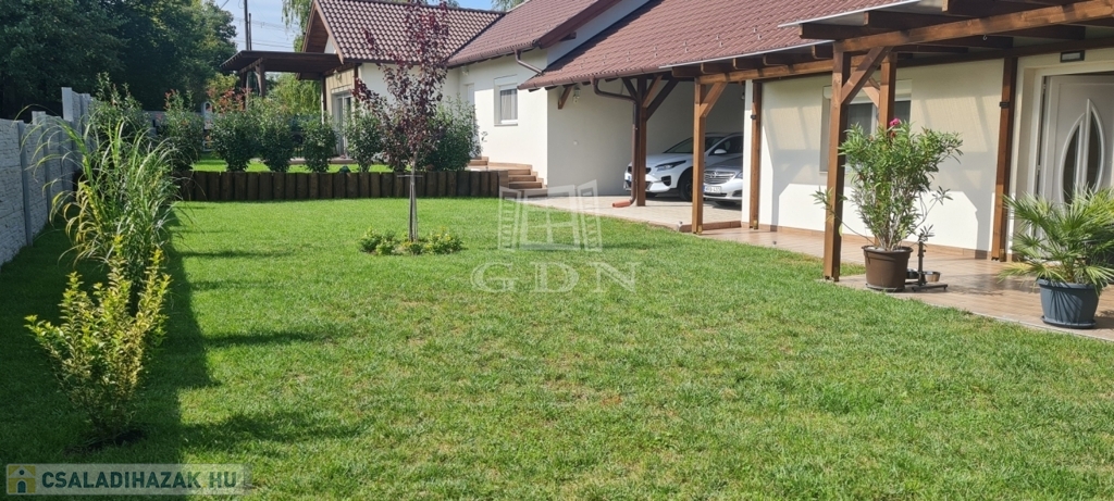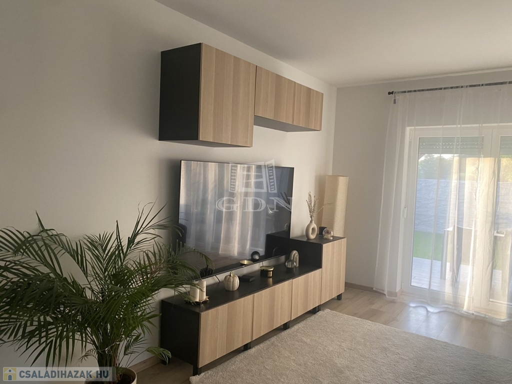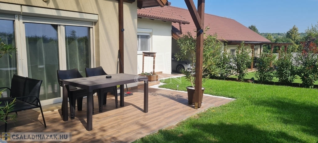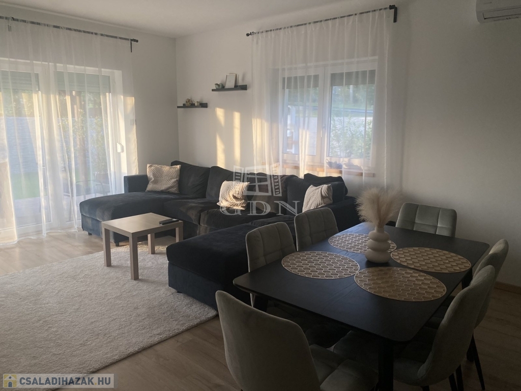Eladó egy újszerű állapotban lévő, 138 m²-es családi ház, amely jogilag családi ház, de kialakításában inkább egy ikerház jellegű ingatlan – az épületek csak a fedett kocsibeállónál érnek össze.