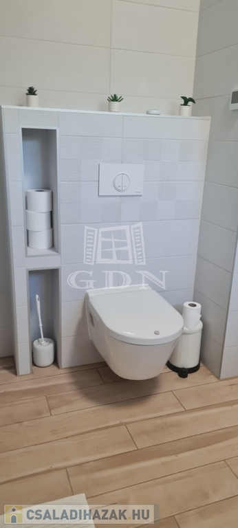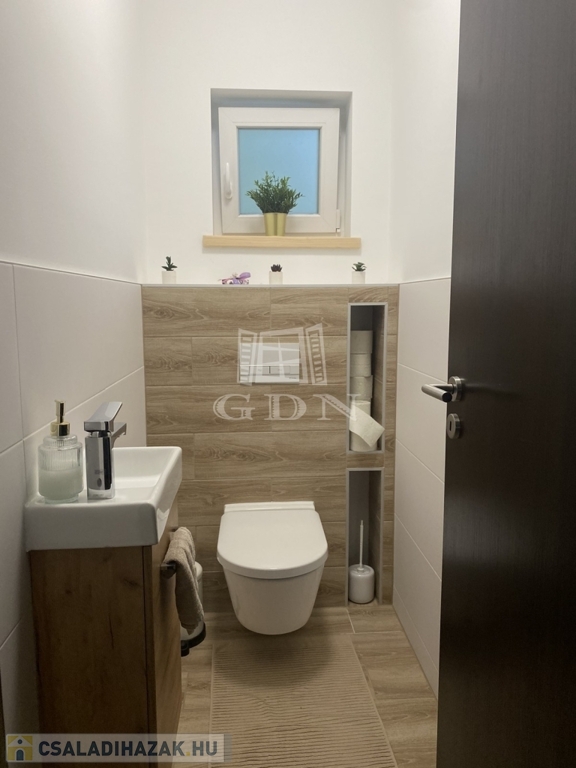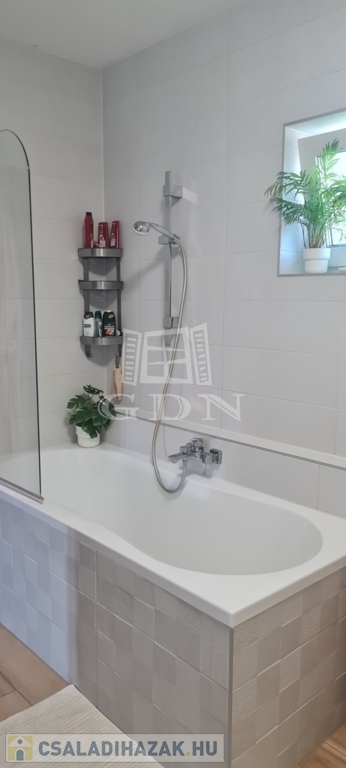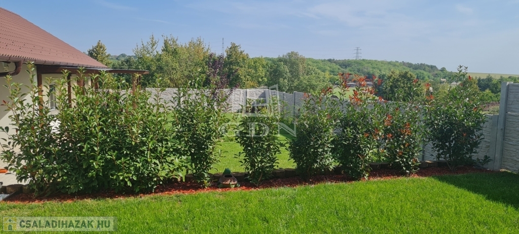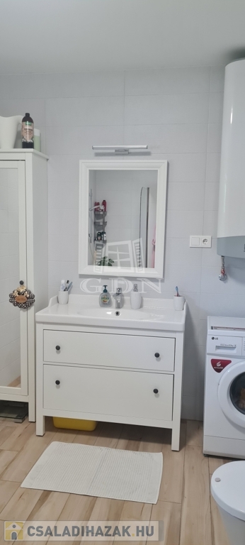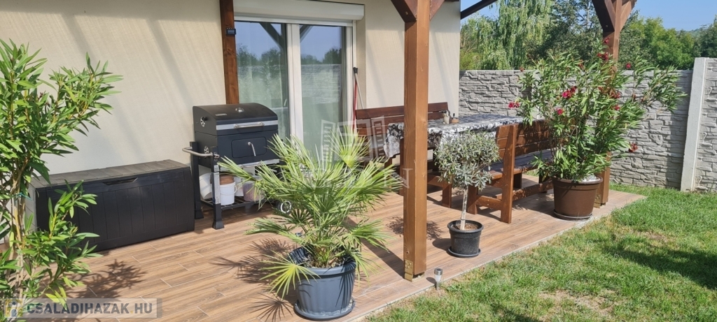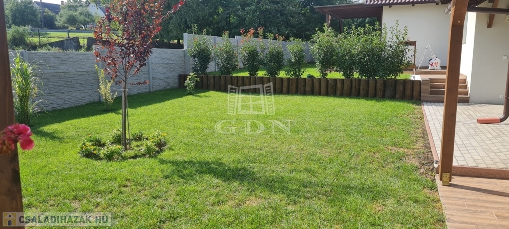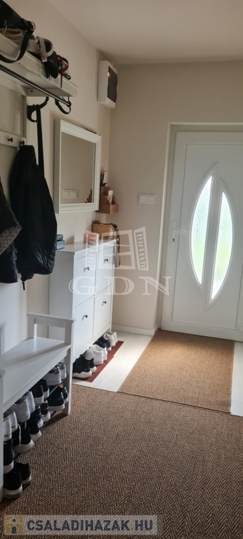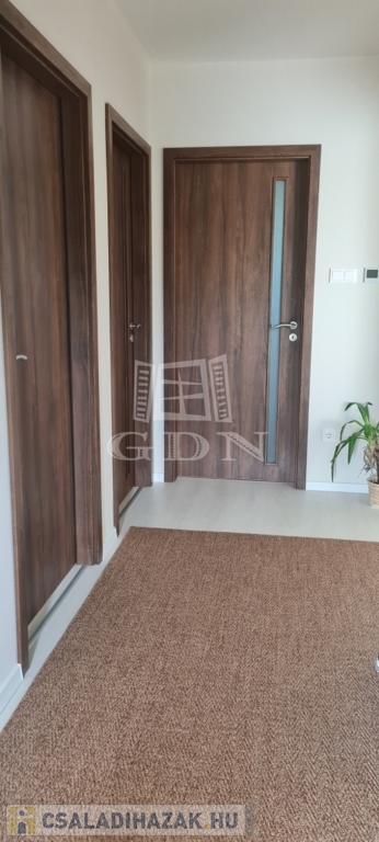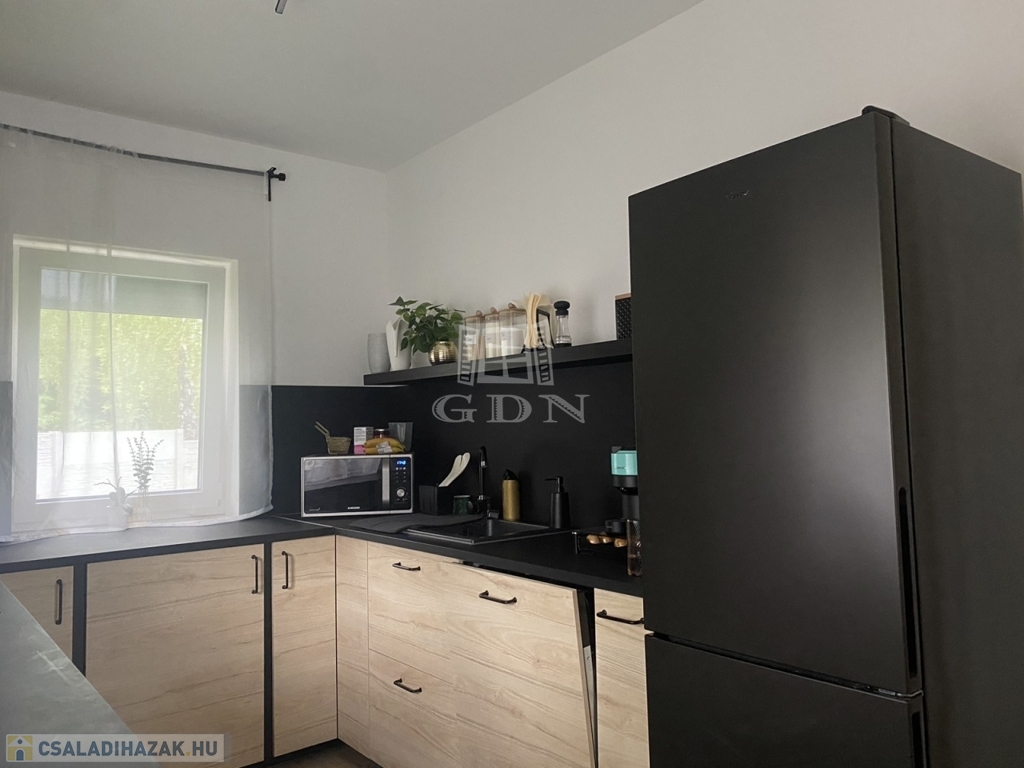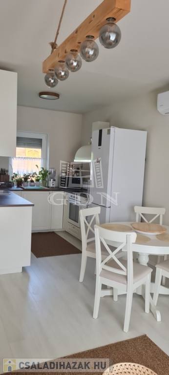 Eladó egy újszerű állapotban lévő, 138 m²-es családi ház, amely jogilag családi ház, de kialakításában inkább egy ikerház jellegű ingatlan – az épületek csak a fedett kocsibeállónál érnek össze.