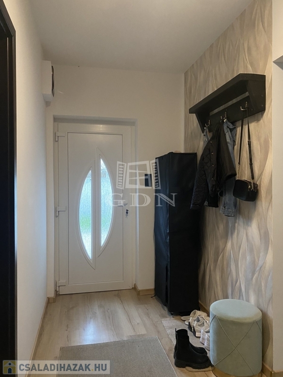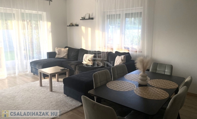 Eladó egy újszerű állapotban lévő, 138 m²-es családi ház, amely jogilag családi ház, de kialakításában inkább egy ikerház jellegű ingatlan – az épületek csak a fedett kocsibeállónál érnek össze.