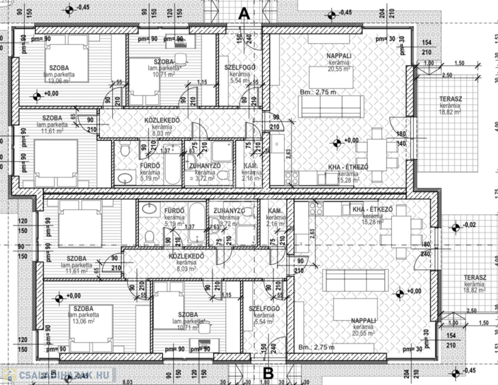 Lakótér: 3 hálószoba, amerikai-konyha, kamra, duplakomfort, terasz.