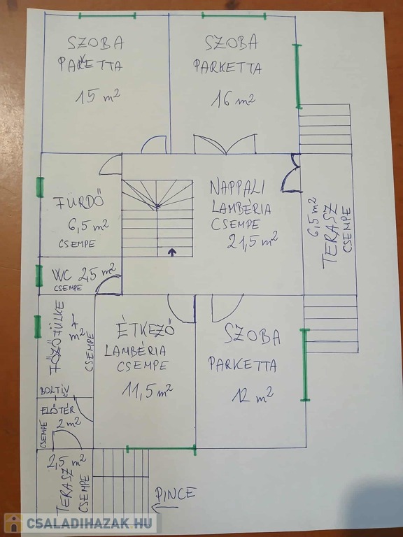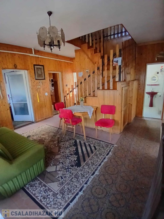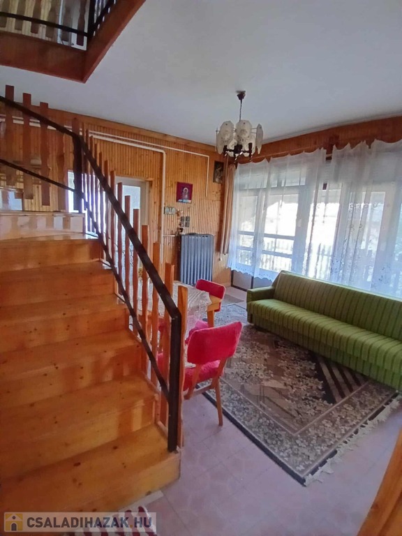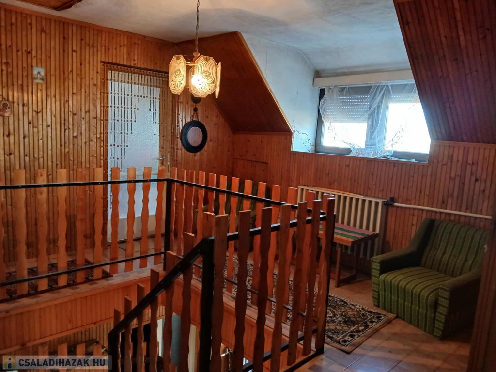 Burkolatok: A szobákban kiváló állapotú, megkímélt parketta található (nem recseg, nincs szét nyílva), a többi helyiségben csempe. A nappali, az emeleti nappali és a konyha oldalait lambéria borítja, ami otthonos hangulatot ad.