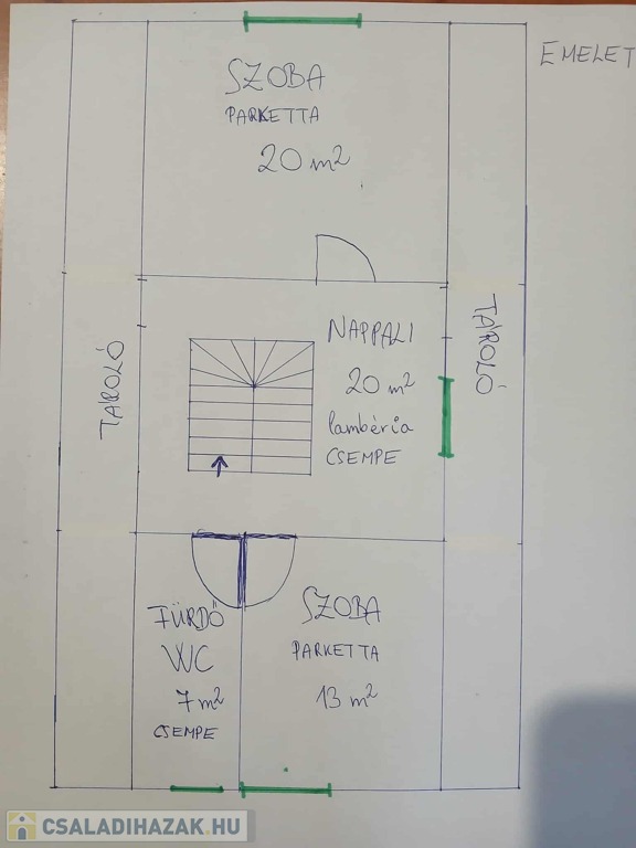 Emelet: (60m2) 2 szoba (parkettás), nappali, fürdőszoba WC-vel, két oldalt tároló.