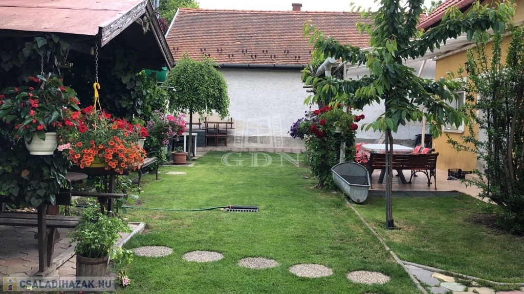 Gondozott kert, automata öntözőrendszerer, ciszterna, kút, 4állások fedett kocsibeálló.