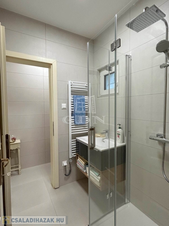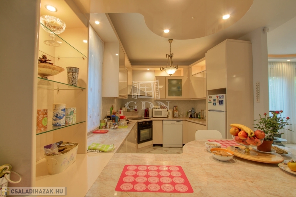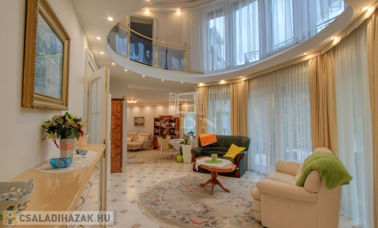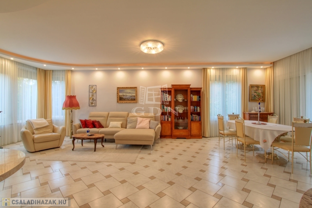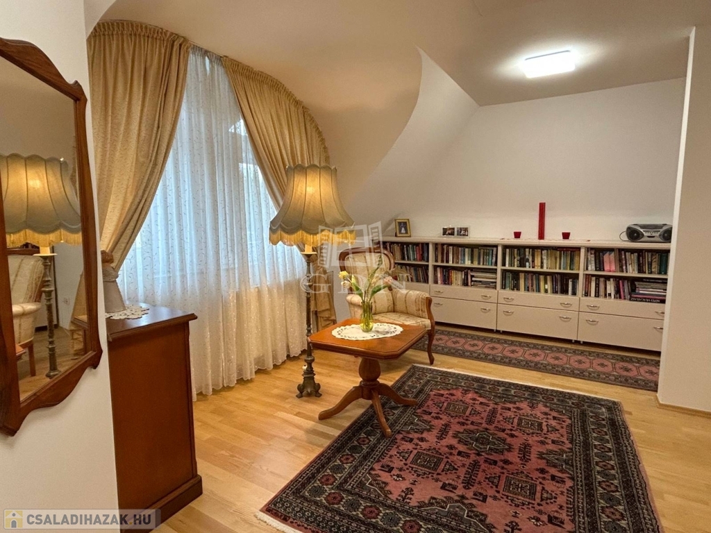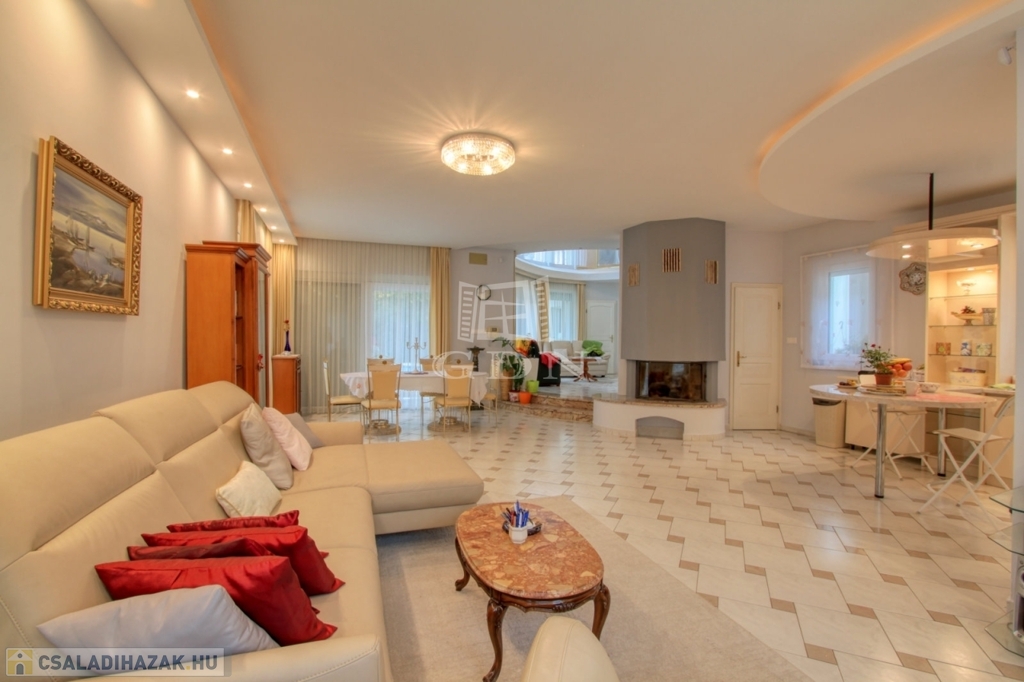 4882. Törökbálint legszebb kertvárosi övezetében a Tükörhegyen, kétlakásos, impozáns enteriőrrel rendelkező, galériás, kiváló állapotú, 7 szobás, riasztóval szerelt, délnyugati fekvésű családi ház garázzsal, hőszivattyús fűtött medencével, parkosított 871 m2-es telken eladó.