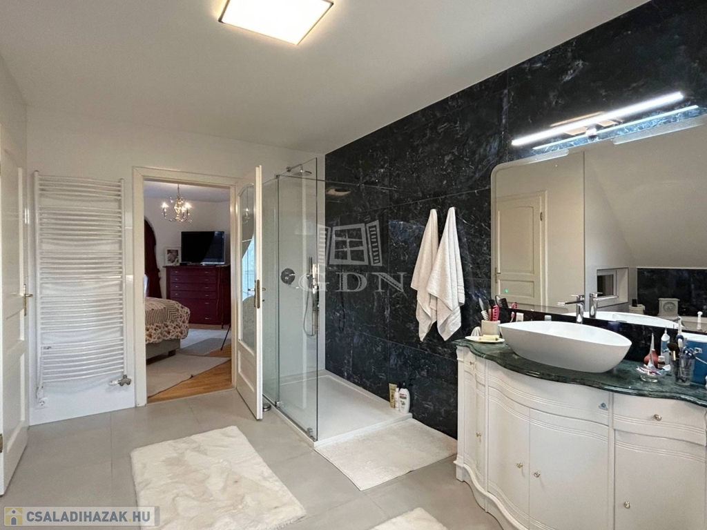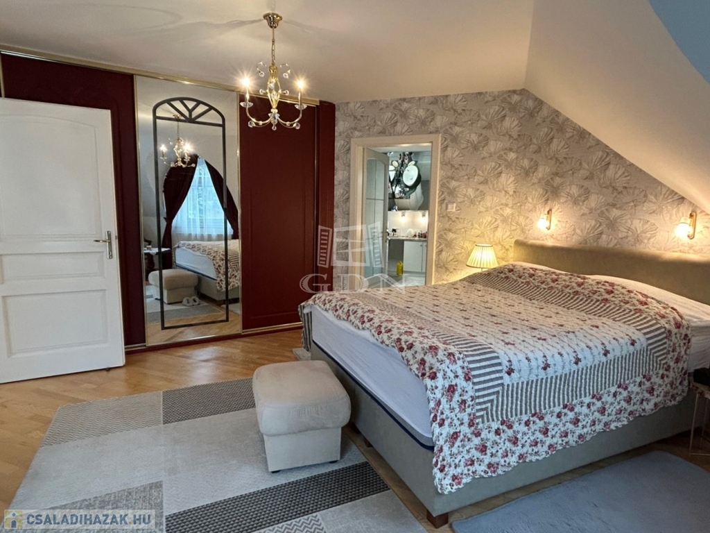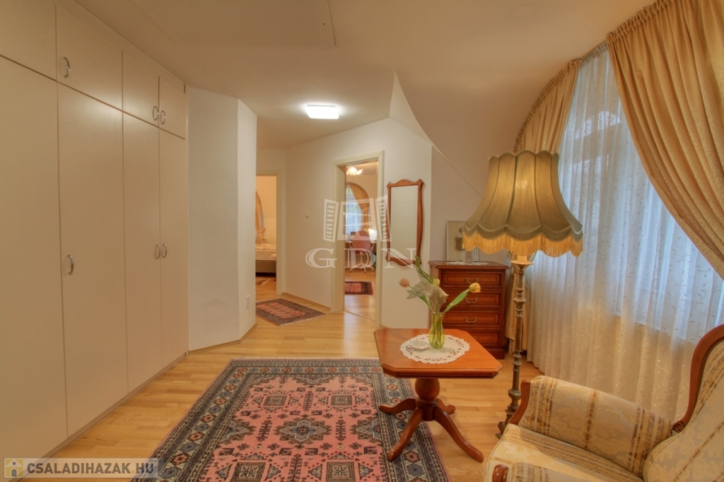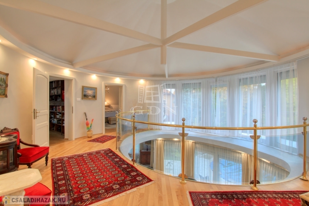 Az emeleti szinten a kör alakú galéria térből juthatunk egy 15 m2-es gardrób szobán keresztül 2 db hálószoba felé (ahol az egyik hálószobához erkély kapcsolat és zuhanyzós fürdőszoba tartozik), illetve a fő hálószoba és dolgozószoba irányába. A fő hálószobából tágas, walk-in zuhanyzóval, pezsgőfürdős káddal rendelkező fürdőszoba nyílik.