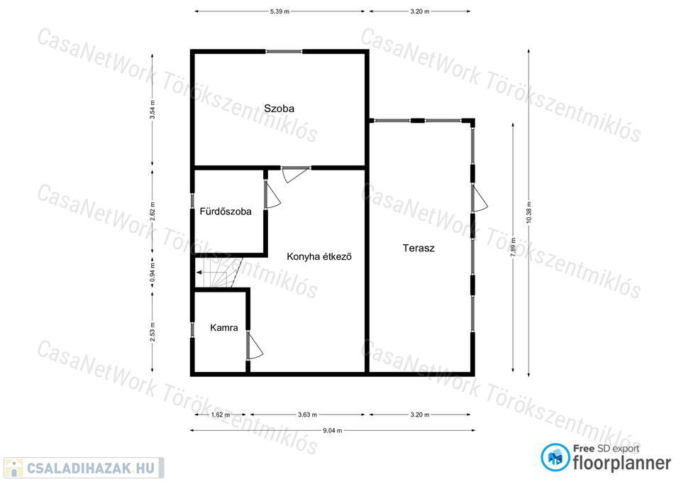 -a földszinten nagy étkező, konyha, tágas, világos zárt terasz, szoba, fürdőszoba