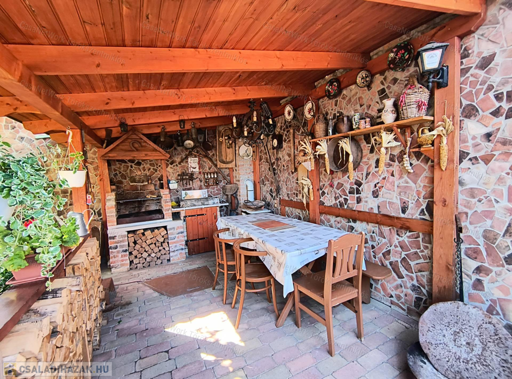 -az udvar sarkában kilakított sütögető tégla kemence, fedett kiülős kerthelyiség