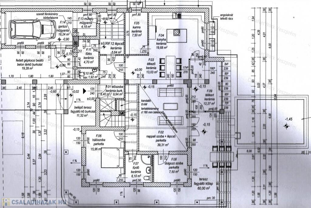 garázs, fürdőszoba, gépészet, közlekedő, tágas nappali- konyha-étkező, kamra, dolgozószoba