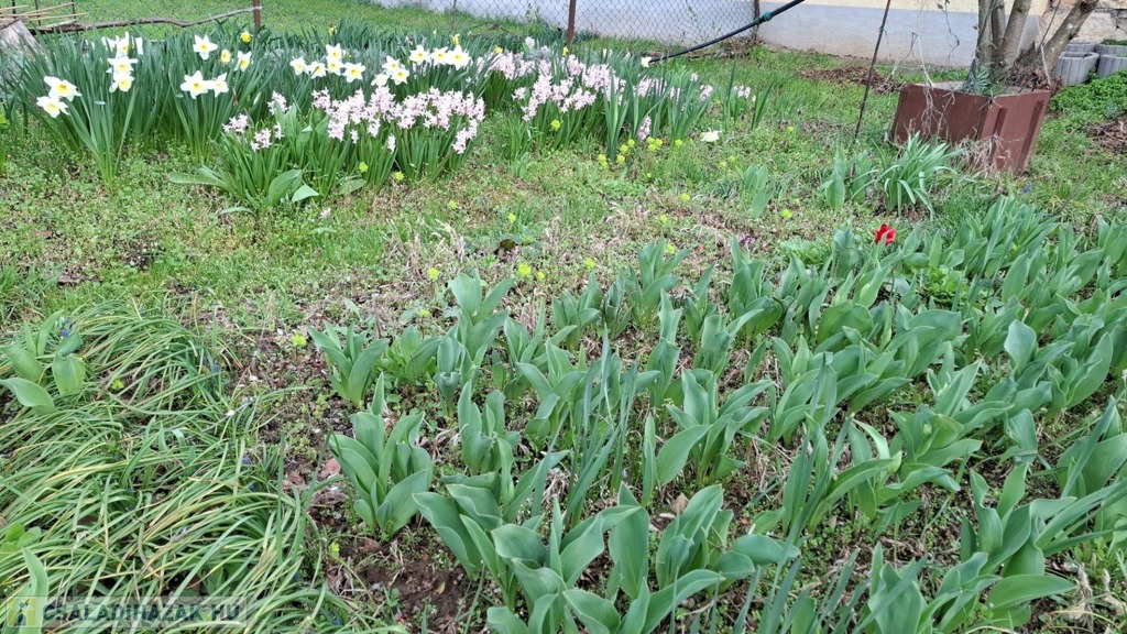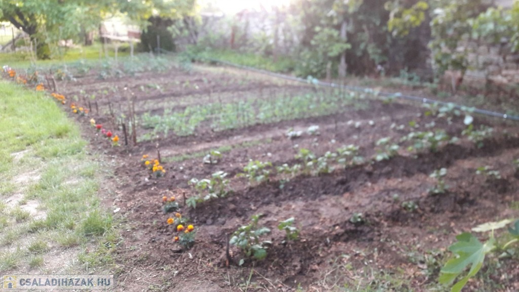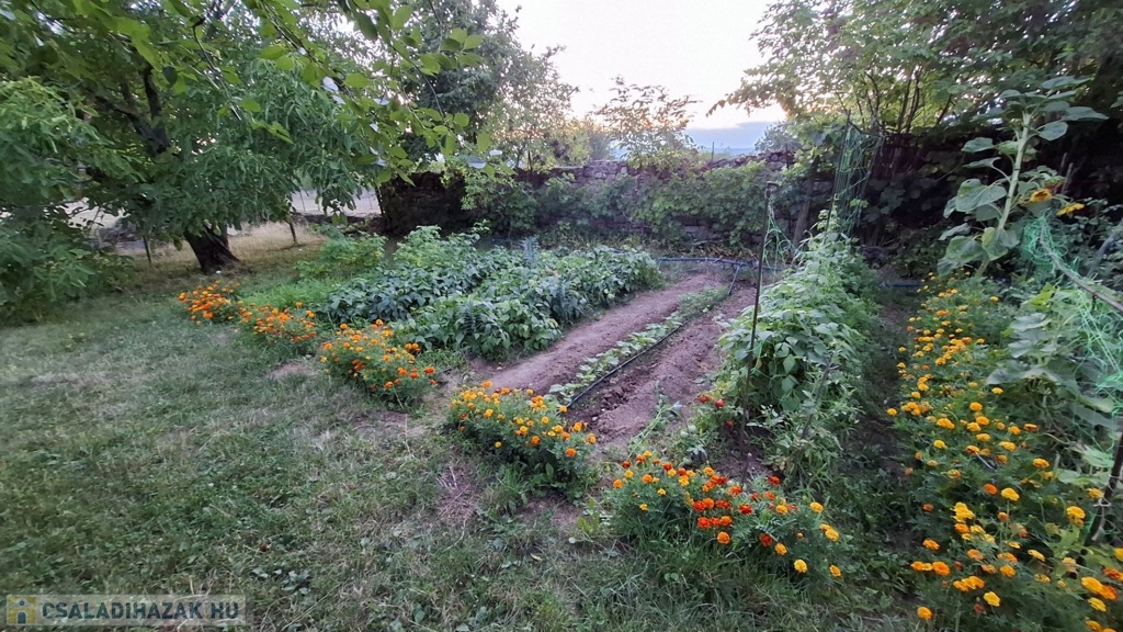 A hatalmas kert igazi kincs: cseresznye, meggy, alma, szilva, ringló, dió, füge, szőlő és mogyoró terem benne, mindez IBC tartályos esővízgyűjtővel és automata öntözőrendszerrel támogatva. Ipari áram bekötése is megtörtént.