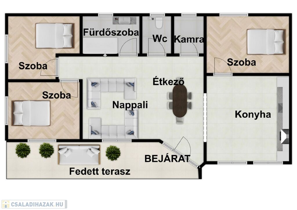 -120nm-es családi ház(amerikai konyhás nappali, 3 szoba, előszoba, fürdőszoba, kamra) mellett 15nm-es terasz