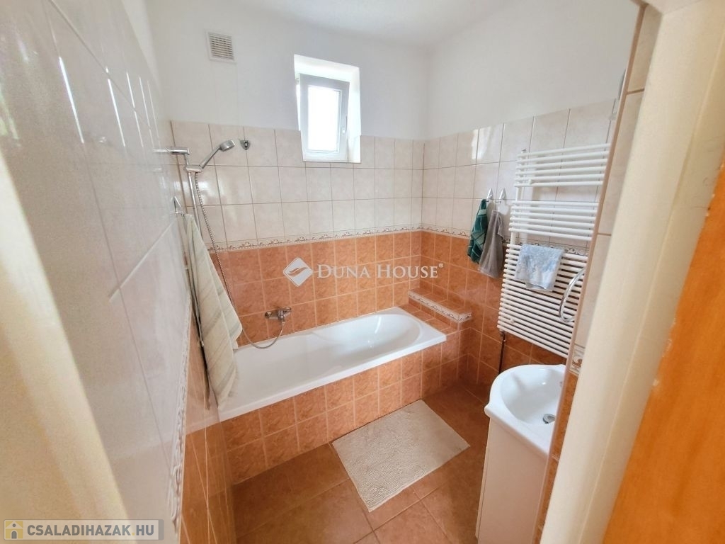 A konyhából nyíló étkezőn keresztül jutunk el a 11 éve felújított fürdőszobába, ahol kényelmes kád biztosítja a pihenést. A falak szerkezete lehetővé teszi a belső terek rugalmas átalakítását, így az ingatlan könnyedén igazítható az új tulajdonos elképzeléseihez.