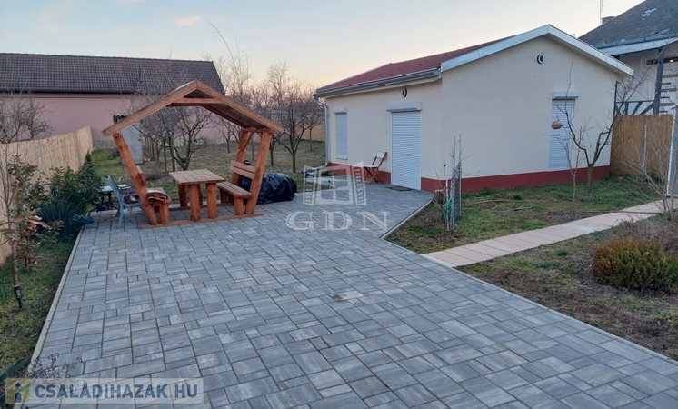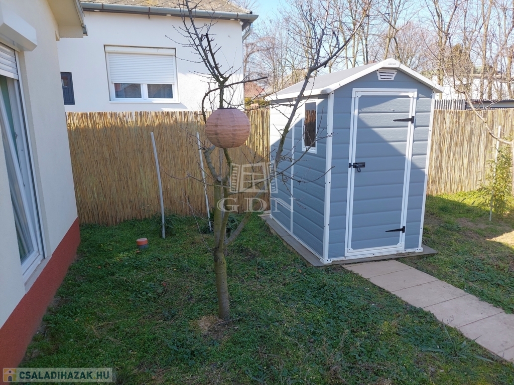 Az előkert részén helyezkedik el egy új kerti szerszámtároló, illetve itt lehet létrehozni egy kis konyhakertet is. A szépen gondozott hátsó kertben fiatal gyümölcsfák találhatók és ezen a területen, szükség esetén a ház további bővítése is lehetséges. A környék kifejezetten csendes, nyugodt kertvárosias. Bár az ingatlan előtt jelenleg még murvával borított út található, de a két szomszédos utca felől aszfaltozott úton közelíthető meg.