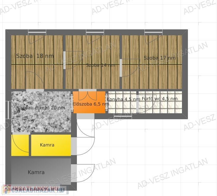 A 60-es években, vályogtéglából épült családi házban 3 szoba, fürdőszoba wc-vel, étkező, fözőfülke, kamra találhatóak.
