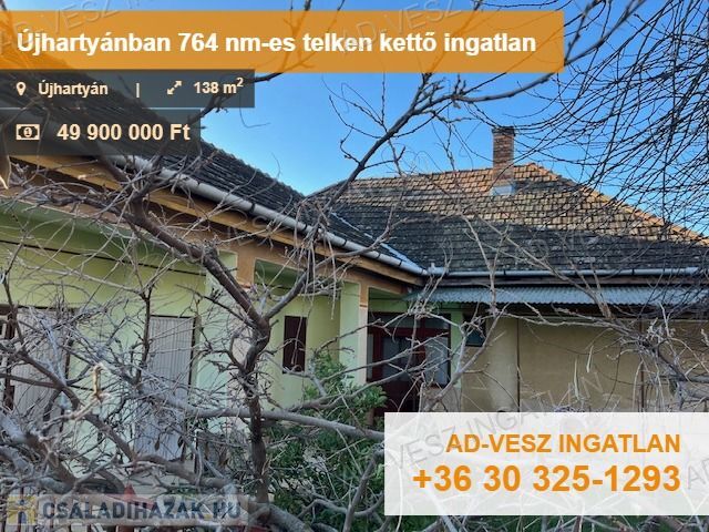 Eladó Pest vármegyében, Újhartyán központi utcájában egy korához képest jó állapotú, 87m2-es családi ház, valamint egy különálló 51m2, tetőtér beépítésű ingatlan.