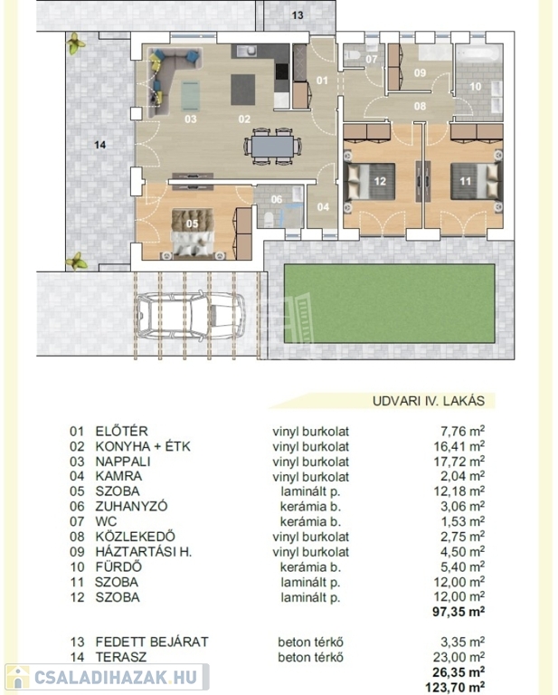 Burkolatok: Vinyl és laminált padlók, kopásálló hidegburkolat, burkolati keret: 5.000 Ft/m²-ig választható