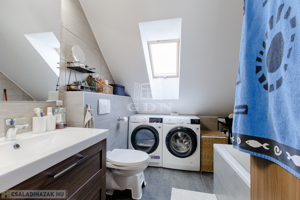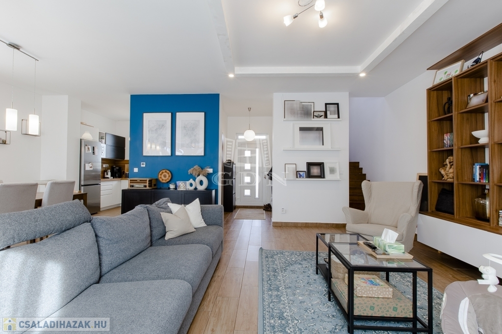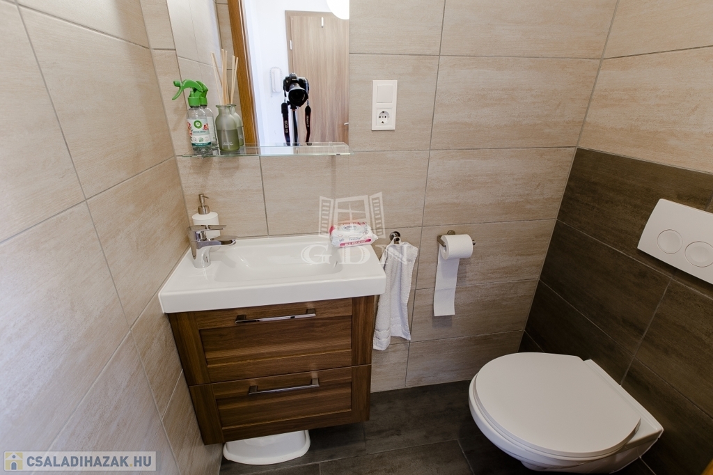 A földszinten található egy gépészeti helyiség, wc kézmosóval, kényelmes nagy nappali konyhával, közvetlen kertkapcsolattal.