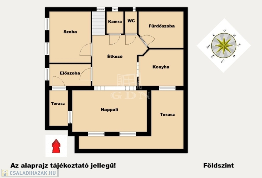 - Földszint: Nappali, Szoba, Előszoba, Étkező, Konyha, Fürdőszoba, WC, Kamra, Terasz
