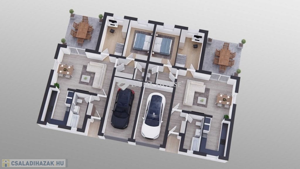 Kialakítása: 2 szoba, nappali, konyha, fürdő, külön wc, előtér, terasz, garázs 18 m2