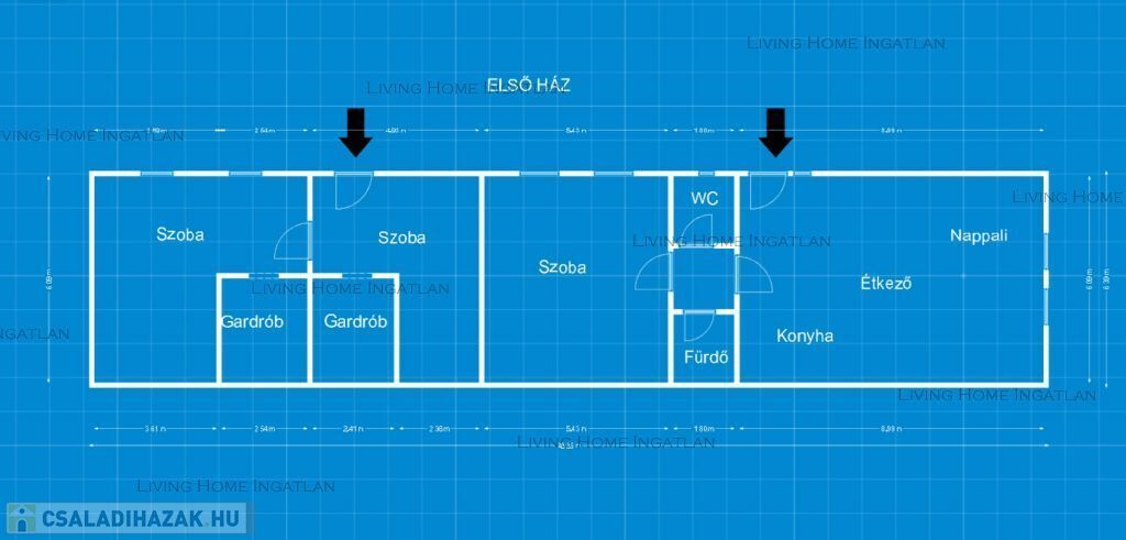 Az első ház 107 nm-es, tágas, világos terek és praktikus elrendezés jellemzi, két bejárattal, nagy hosszanti terasszal.