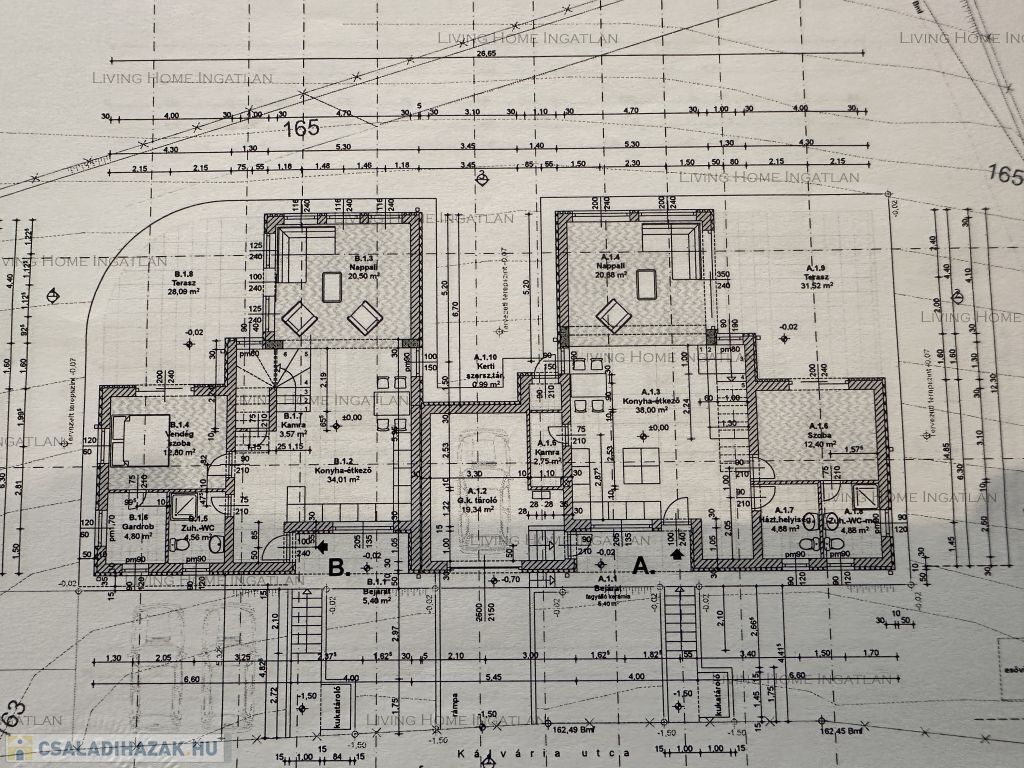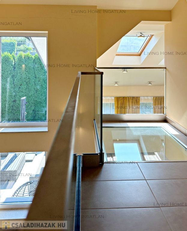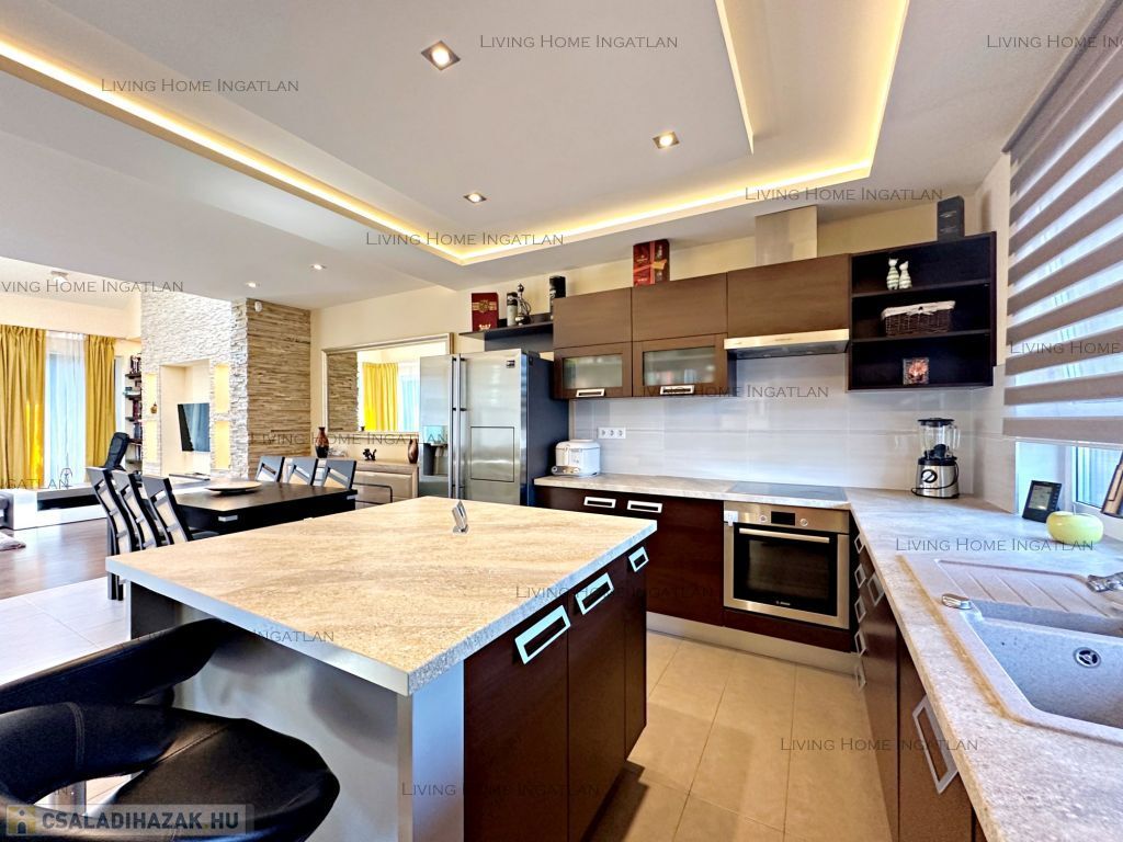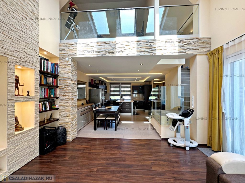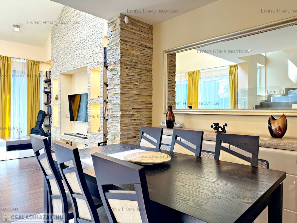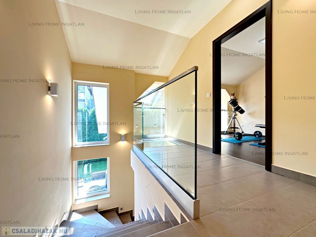 Földszint: Az előszobán keresztül jutunk a tágas, amerikai-konyhás nappaliba. A konyha egyedi bútorokkal berendezett, teljesen gépesített, konyhaszigettel is rendelkezik. A nappali különlegessége az extra belmagasság, az egyedi, galériás megoldás és a különleges, kő falburkolat. Innen közvetlen kapcsolat van a teraszra és a kertbe. Ezen a szinten van még egy teraszkapcsolatos vendégháló, külön, hozzátartozó gardróbbal és tusolós fürdőszoba. Praktikus és kényelmes a lépcső alatti tároló helyiség, a kamra mosógép kiállással.