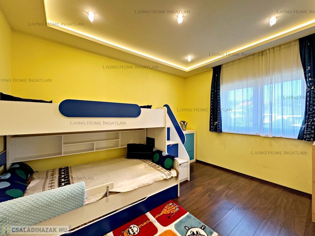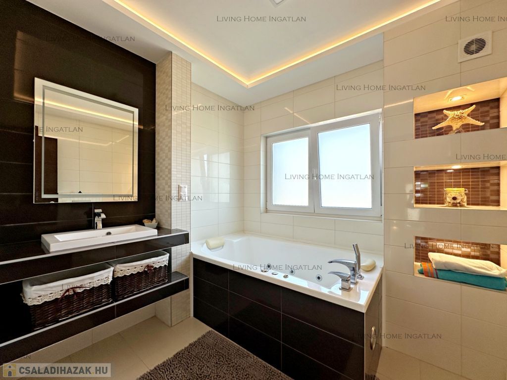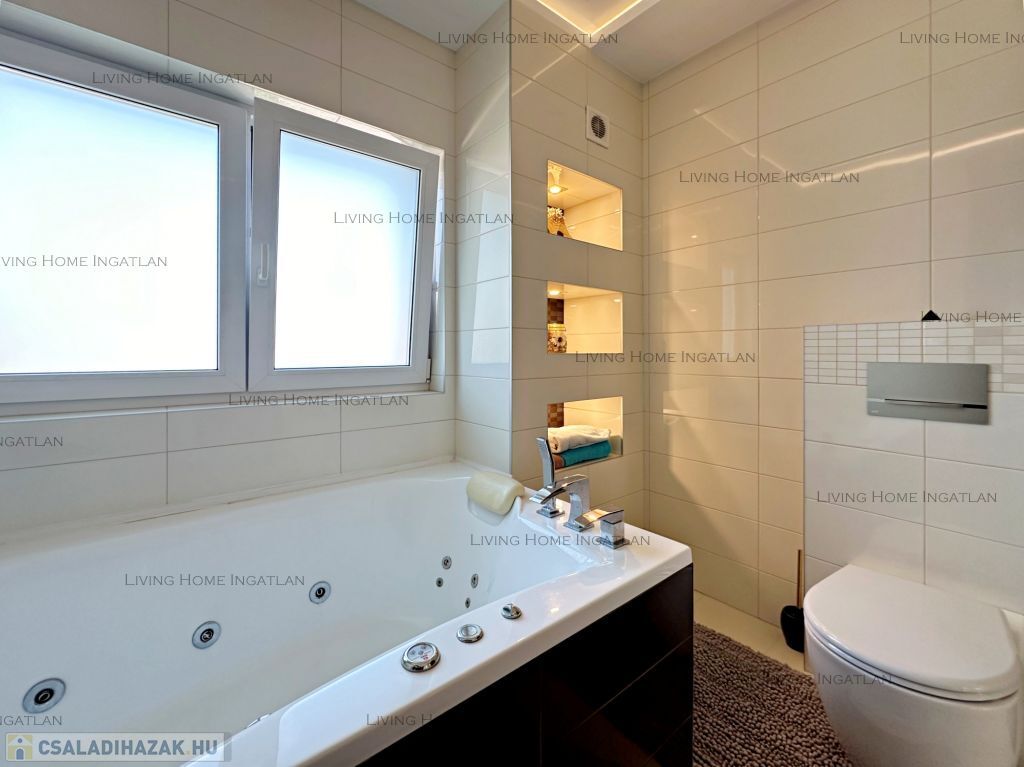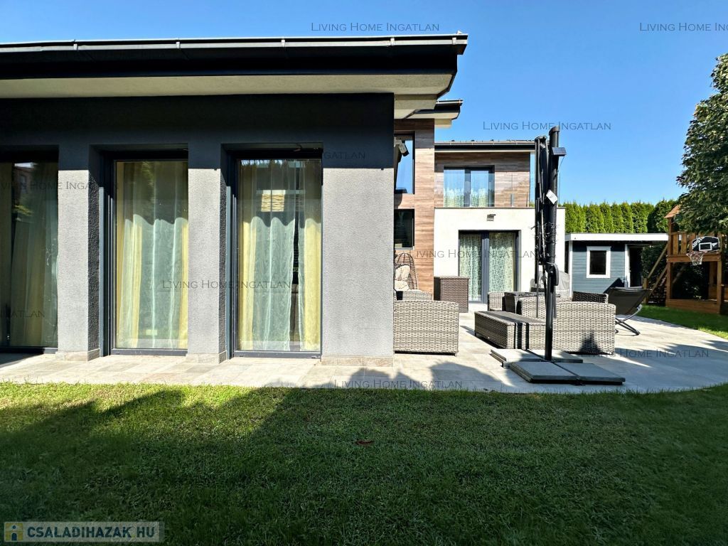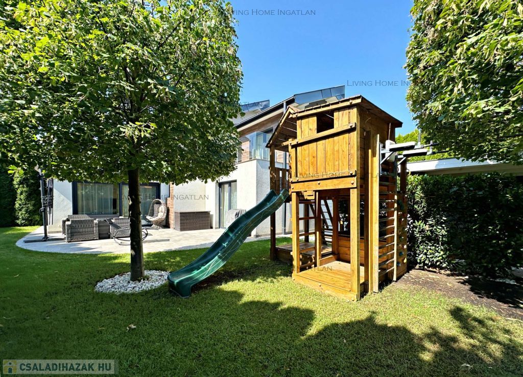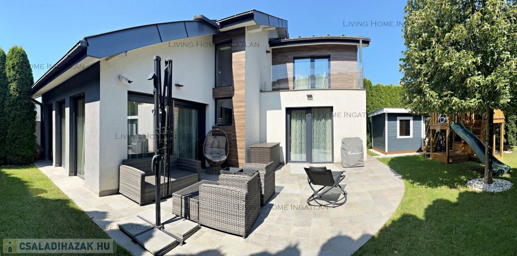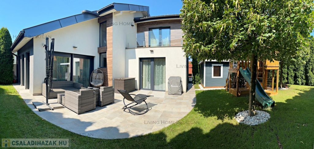 Panorámaliget is a modern new residential complex in Üröm, located near Budapest, at the foot of the mountains and offering beautiful panoramic views of the surrounding countryside. The semi-detached house is located in a quiet dead-end with no through traffic. The property has the feel of a completely detached family house, as the living area and the garden are completely separated, the common wall is double and soundproofed. The plot of 435 sqm is surrounded by ornamental trees, beautifully landscaped, and the irrigation is provided by an automatic irrigation system. Small children can play on the wooden playground with a slide and climbing frame in the middle of the garden, while adults can enjoy the 4-person sauna in a separate building or the jacuzzi on the terrace. Even larger groups can be comfortably accommodated in the seating area on the terrace. Through an automatic garage door, the garden can comfortably accommodate two vehicles in the paved, paved parking area.