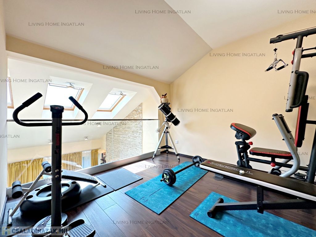 Emelet: Tágas, különleges lépcsőn jutunk az emeletre, ahol három hálószoba és egy káddal felszerelt fürdő található. A galériás szoba jelenleg fitness helyiségként van berendezve, itt lehet feltöltődni, kikapcsolódni. Az egyik hálóhoz tartozik egy 9 nm-es erkély is, ahonnan gyönyörű kilátás nyílik a környező tájra, erdőre. A fürdőben nagy masszázskád van beépítve.