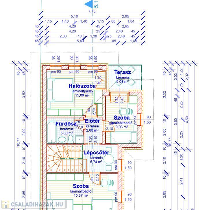 Emelet: kádas-zuhanyzós fürdőszoba+WC, 3 hálószoba (kettő saját közös terasszal), közlekedő.