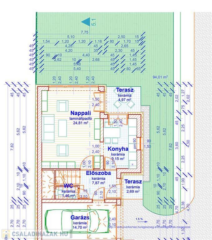 Földszint: előszoba, garázs, WC, kamra, konyha-étkező-nappali kertkapcsolattal.