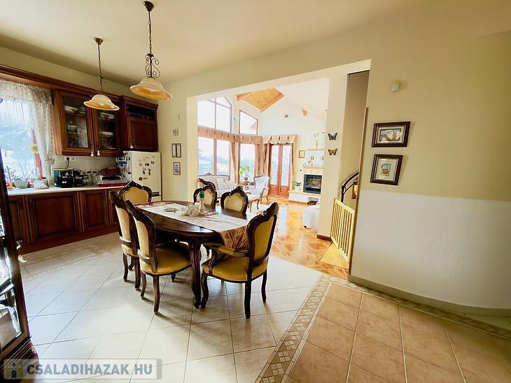 A 350 nm-es, világos és jól átgondolt elosztású családi ház több szinten biztosít kényelmes életteret. A földszinten két szoba, tágas nappali, konyha, étkező, fürdőszoba, tároló és gépészeti helyiség található, valamint pince és egy kétállásos garázs. Az emeleten előszoba, három hálószoba, amerikai konyhás nappali, amelyből nyílik a panorámás terasz, valamint fürdőszoba és külön WC kapott helyet, míg a tetőtérben egy további szoba került kialakításra.