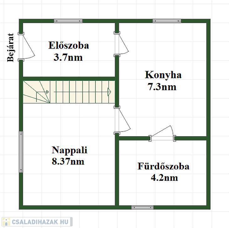 Alsó szint: előszoba, nappali, konyha, fürdőszoba