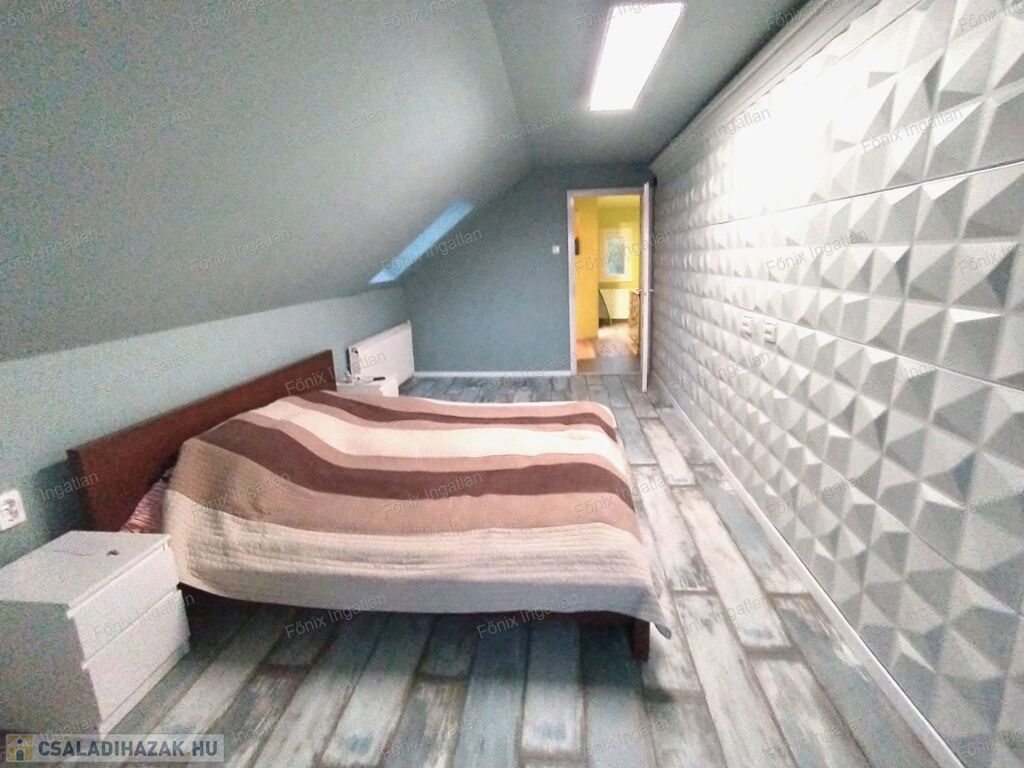 Az emeleti szint 60 m² beépített területet kínál egy 5 m²-es erkéllyel, 2 szobás, egy fürdőszobával, ahonnan szép kilátás nyílik a rendezett kertre. Az ingatlanhoz tartozik továbbá egy 40 m²-es garázs és melléképület is, ami bőséges tárolási lehetőséget biztosít.