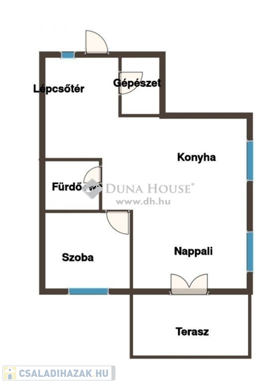 földszinten: szoba, tágas nappali+konyha, zuhanyzó+wc, gépészet, nyitott terasz.