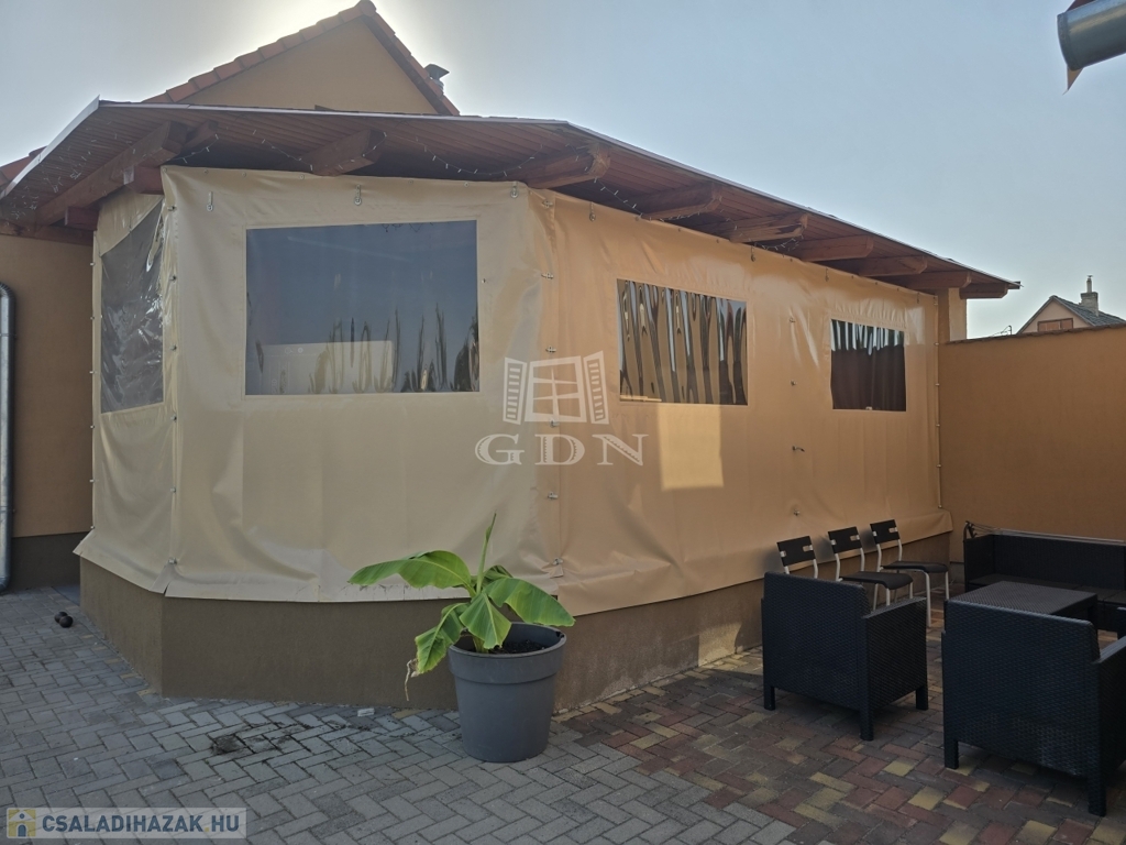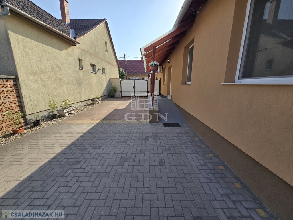 Az ingatlan egy 903 m²-es telken helyezkedik el, amelynek csaknem 70%-a térkővel burkolt, így minimális karbantartást igényel, ugyanakkor esztétikus és jól használható udvart biztosít. Az elektromosan működtethető új kapu kényelmes bejutást biztosít, a gyalogos bejáratnál kamera gondoskodik a biztonságról.
