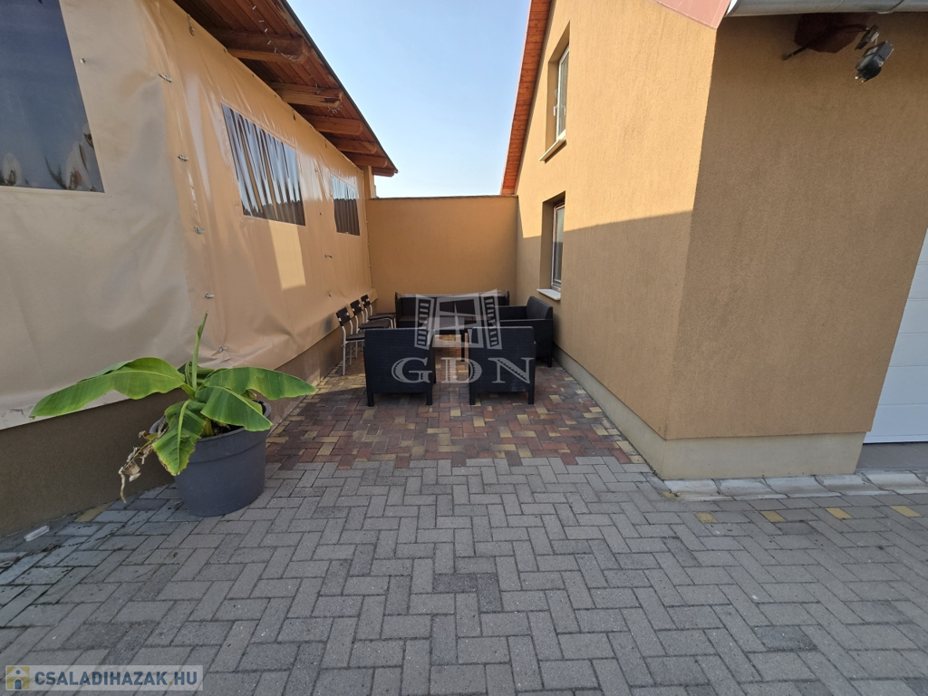Az ingatlan egy 903 m²-es telken helyezkedik el, amelynek csaknem 70%-a térkővel burkolt, így minimális karbantartást igényel, ugyanakkor esztétikus és jól használható udvart biztosít. Az elektromosan működtethető új kapu kényelmes bejutást biztosít, a gyalogos bejáratnál kamera gondoskodik a biztonságról.