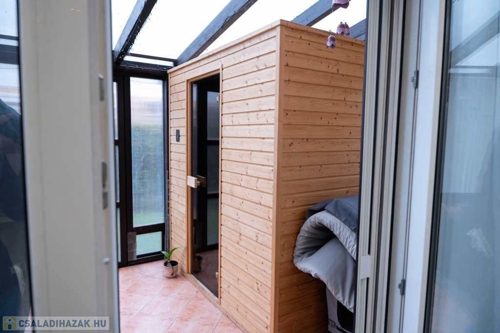 A teraszon négyszemélyes szauna található, amely finn szauna kályhaként és infraszaunaként is üzemel.