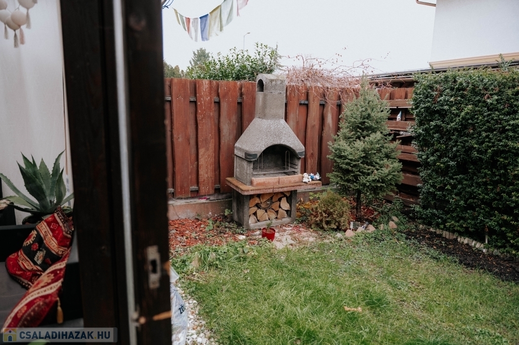 Kertkapcsolatos ingatlan: A ház egyik oldala a csendes utcára, másik oldala a saját, körülkerített kertre néz. A kb. 30 m²-es kert füves, grillezési lehetőséggel rendelkezik.
