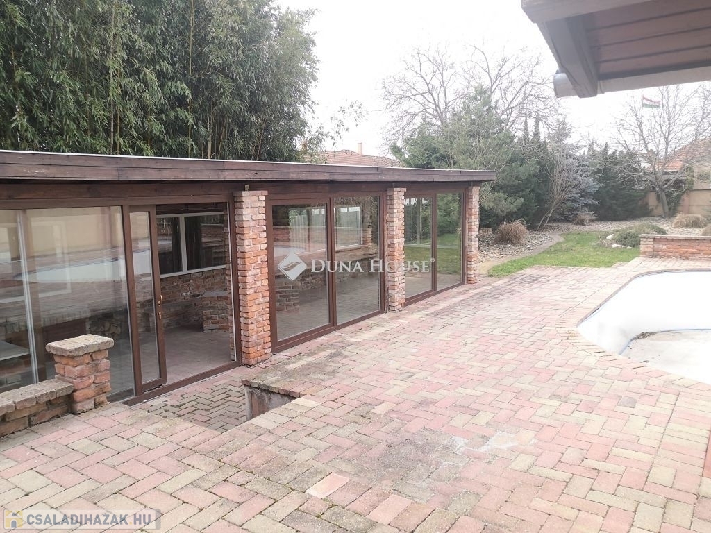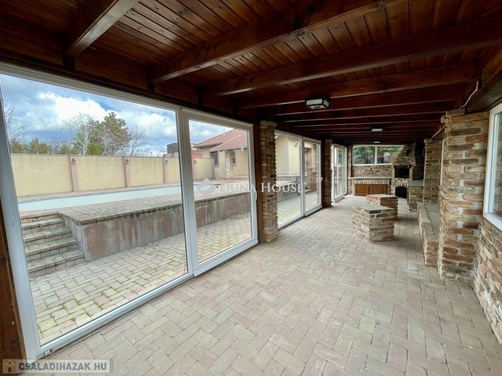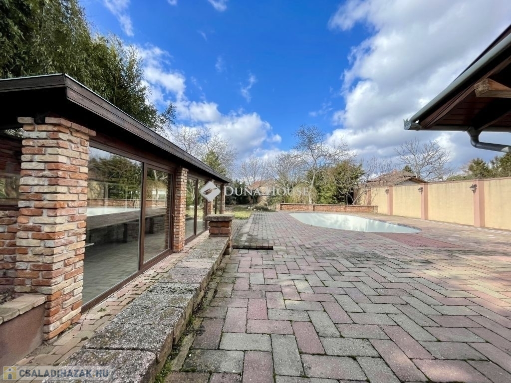 A kinti időtöltés középpontja a ház mögött, belátástól mentes területen megépült, úszáshoz is elegendő méretű medence, melyhez egy az irányában teljes üvegfallal rendelkező kerti pavilon csatlakozik, ahol épített sütögető is megtalálható, akár nagyobb léptékű családi, baráti rendezvények megtartására is ideális.
