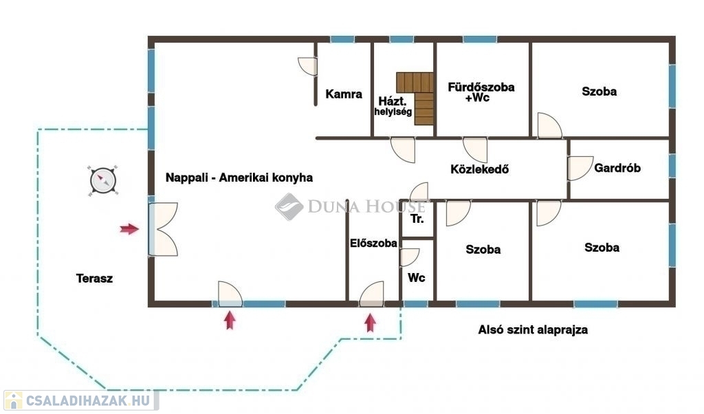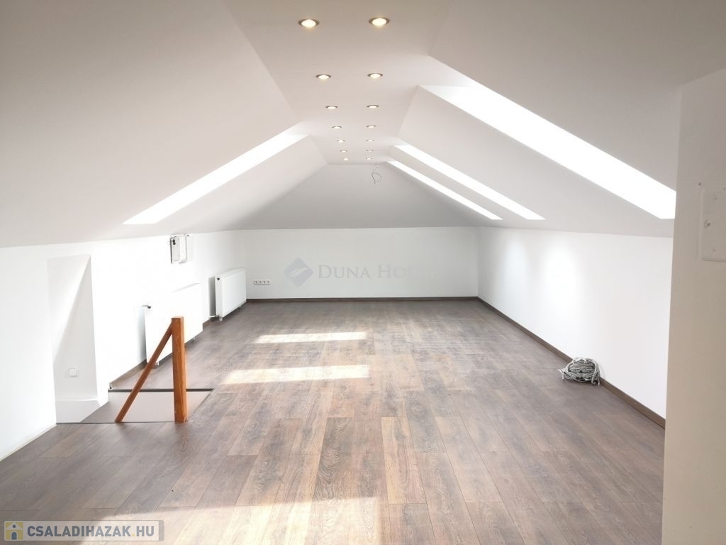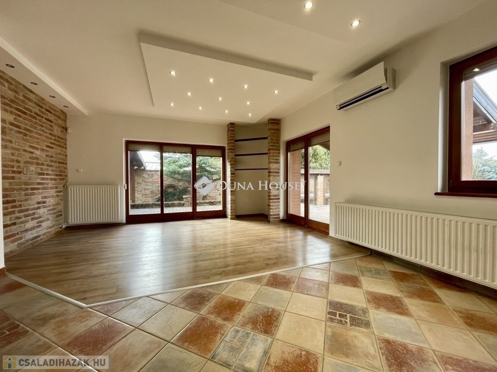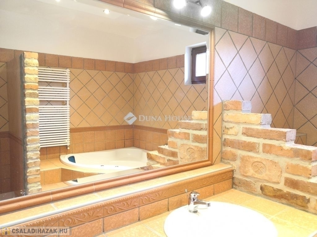 Az ingatlan földszint + beépített tetőtér kilakítással rendelkezik. Alsó szintjén egy tágas (közel 40m2-es) amerikai konyhás, teraszkapcsolatos nappaliszoba, 3 különnyíló hálószoba, egy fürdőszoba+wc, egy külön wc, egy háztartási helyiség, egy előszoba, közlekedő továbbá tároláshoz praktikusan egy tágas kamra, egy gardrób, és egy kisebb tárolóhelyiség kaptak helyet. A felső szinten egy nettó 30m2-es, egy légterű, tetőtéri szoba található. Az ingatlan minden helyisége kifejezetten jó fényviszonyú, a jól átgondolt elrendezésnek köszönhetően kiválóan berendezhető. A lakótérből a nappali irányában kilépve egy 36m2-es, fedett teraszra érkezünk, mely kialakításában kapcsolódik a medencéhez, és a sütögetéshez is ideális kerti pavilonhoz.