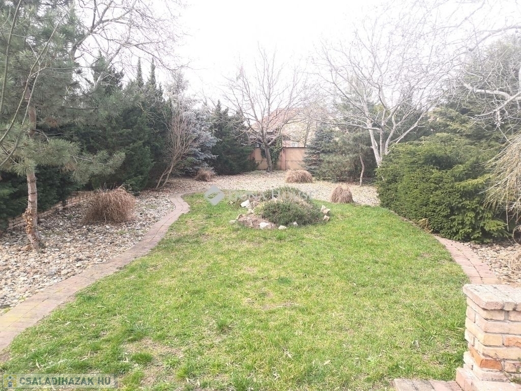 A házhoz tartozó 1678m2-es telekterület szépen rendezett. Az autóbeálláshoz, járdaként, illetve kinti időtöltéshez adott területek jó minőségű térkővel fedettek, emellett zöldterület, épített kert, sziklakert is megtalálható a kifejezetten tágas területen. Parkoláshoz 2 darab, 2 állásos garázs áll erndelkezésre, melyek természetesen távirányítható, elektromos kapuval nyithatóak, akárcsak a telekre bejáratot biztosító kapu. Mindkét garázsban elektromos autótöltéshez is rendelkezésre áll kiállás. Térkövezett területen ezen felül is megoldott további autók parkolása. Tároláshoz egy további tágas tárolóhelyyiség, és egy borospince jellegű, boltíves, száraz pince is rendelkezésre áll (nem a ház alatt található).