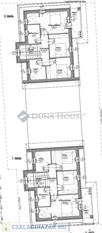 Az ikerház mindkét fele önálló, privát kerttel rendelkezik, kizárólag a 36 m²-es, kétállásos garázsnál érintkeznek egymással.