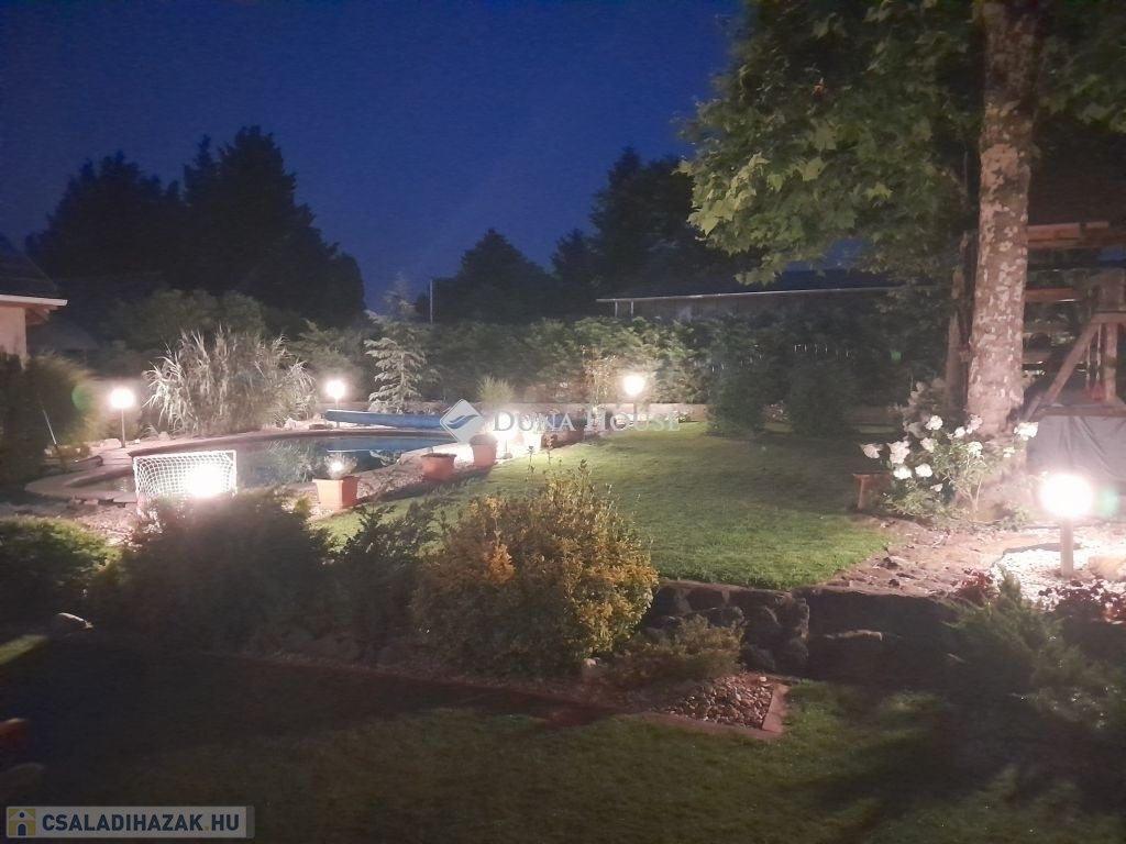 Medencéről tudnivalók : 12mtr x 6mtr-es vese alakú, amelynek tisztántartásáról medenceporszívó robot gondoskodik. A medence külön téli, és nyári takaróval is rendelkezik. A gépesítés a medence mellett található kis épületben kapott helyet. A kertben alkonykapcsolóval ellátott hangulatos világítás is helyett kapott.