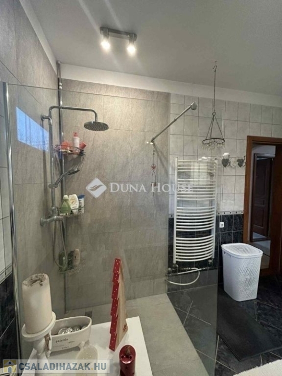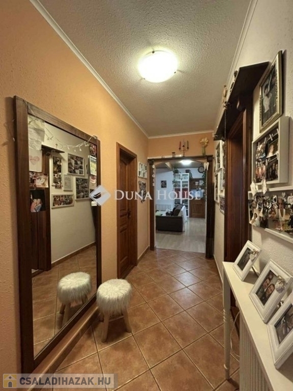 Kialakítása: 3 szoba, tágas nappal+étkező, konyha, háztartási helyiség, zuhanyzó+wc, tágas fürdőszoba és wc ahol zuhanyzó és kád is megtalálható, közlekedő, kamra, 20 m2-es garázs házon belül ki és bejárás. További 50 m2-es terasz a ház körül melynek egy része zárható, téli kertnek funkcionál.