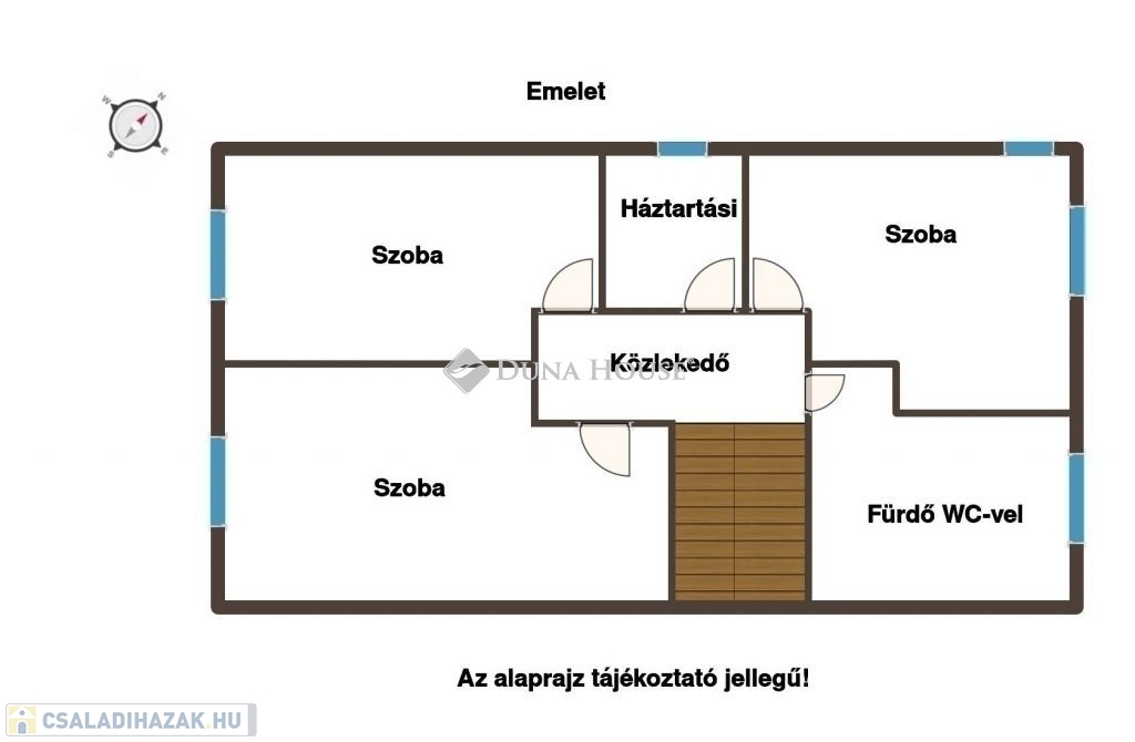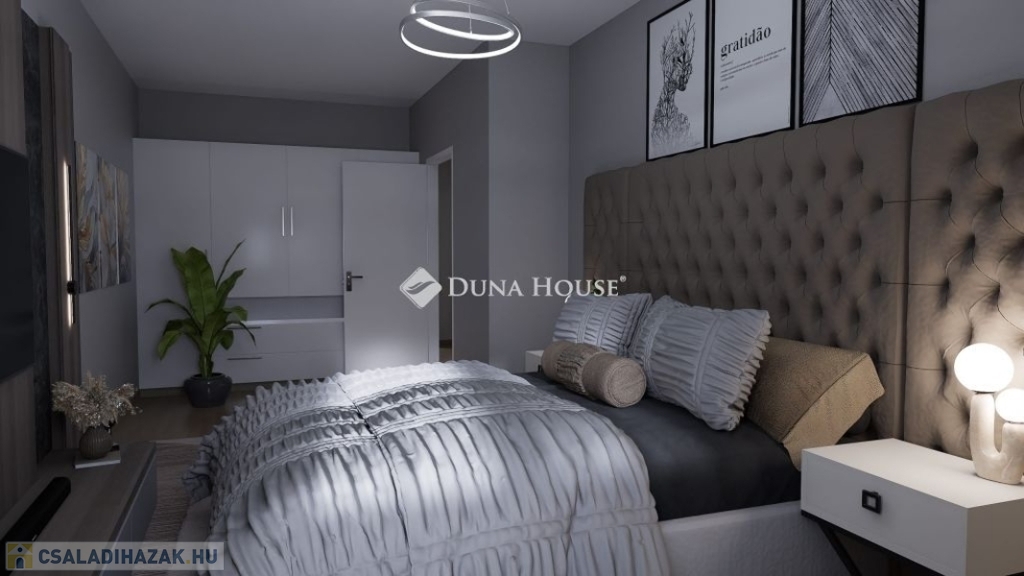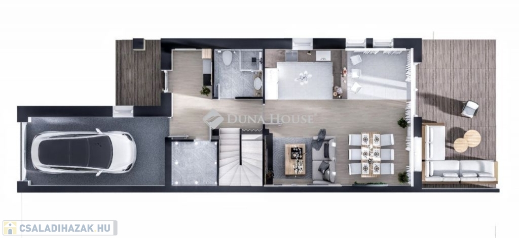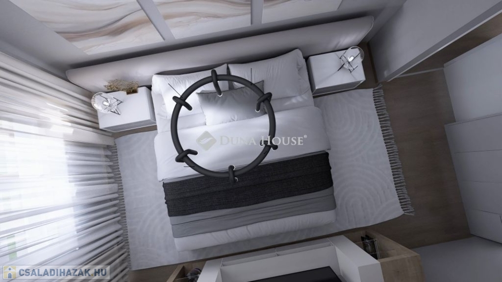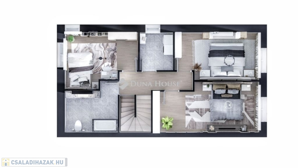 Belépés után az előszobában találjuk magunkat rögtön balra a gépházat található, mellette a lépcsőfeljáró. A lépcsővel szemben az egyik fürdőszoba található. Az előszobában továbbhaladva jobbra az amerikai konyhás nappali helyezkedik el, ahonnan kijuthatunk a teraszra és a lakáshoz tartozó saját kertbe. Balra meg a nappali.A felső szintre jutva jobbra még egy fürdőszoba, szemben egy szoba található. A lépcsőfeljáróval szemben a háztartási helyiség áll rendelkezésre. Balra két hálószoba található.