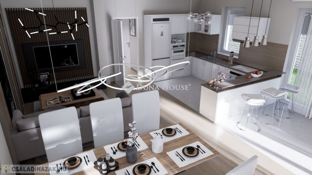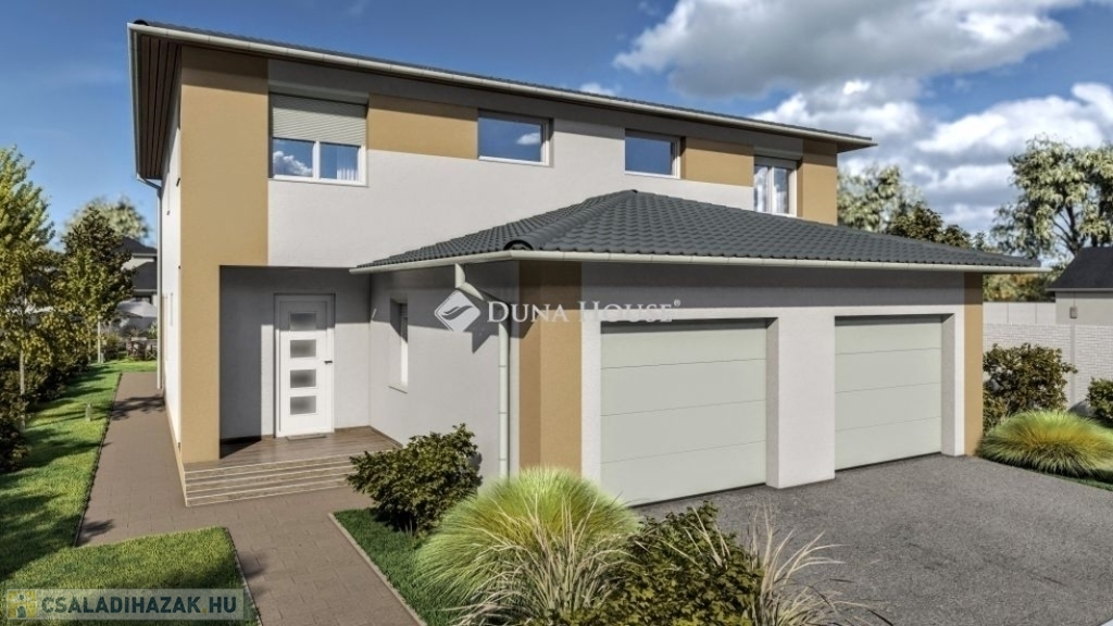 Eladó Vecsés Felsőhalmon egy 147 nm alapterületű, nappali+ három halószobás, belső kétszintes, 424nm-es saját kerttel, garázzsal, hőszivattyús fűtéssel rendelkező, újépítésű ikerház egyik fele.