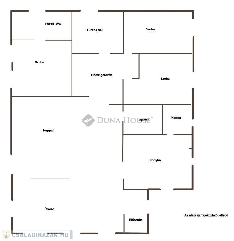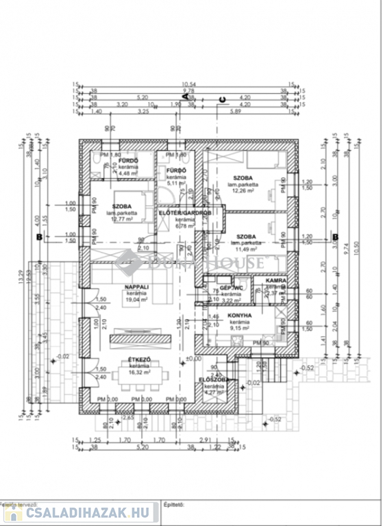 - Előszoba, nappali + étkező + 3 szoba, konyha, kamra, 2 fürdő, 3 WC, gépészeti helyiség