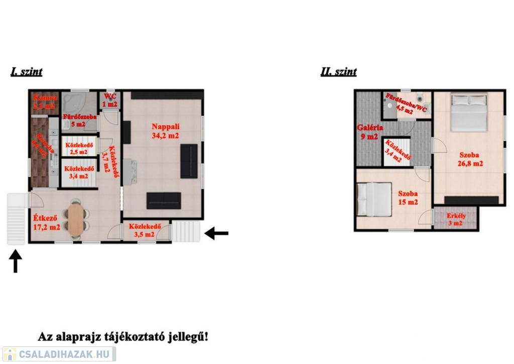 - Emelet ( 60 m² ): két hálószoba, fürdőszoba, erkély