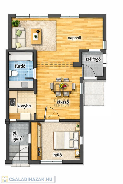 Földszint: amerikai konyhás nappali–étkező, hálószoba, fürdőszoba mellékhelyiséggel