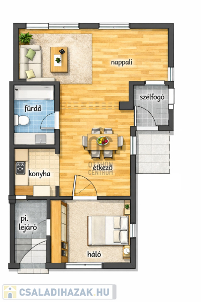 • Földszint: amerikai konyhás nappali–étkező, hálószoba, fürdőszoba mellékhelyiséggel