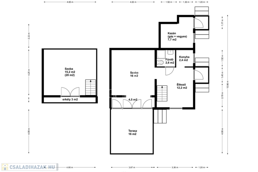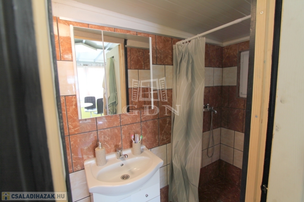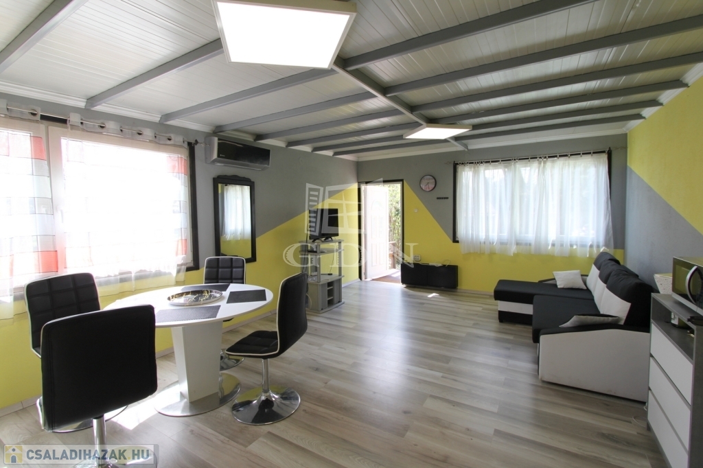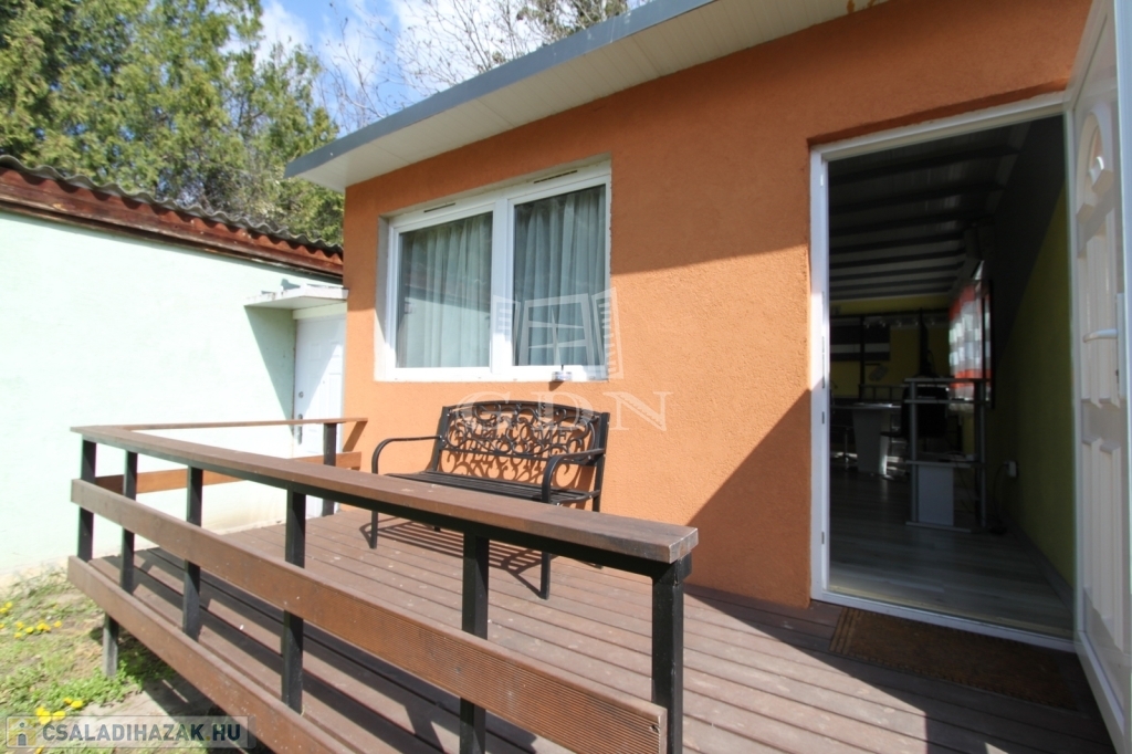 Vendégház 2: könnyűszerkezetes (fém vázszerkezet, kőzetgyapot szigetelés), kívülről is hőszigetelt, újszerű állapotú, 35 m2 lakótér + 7 m2 terasz, klímával fűthető/hűthető
